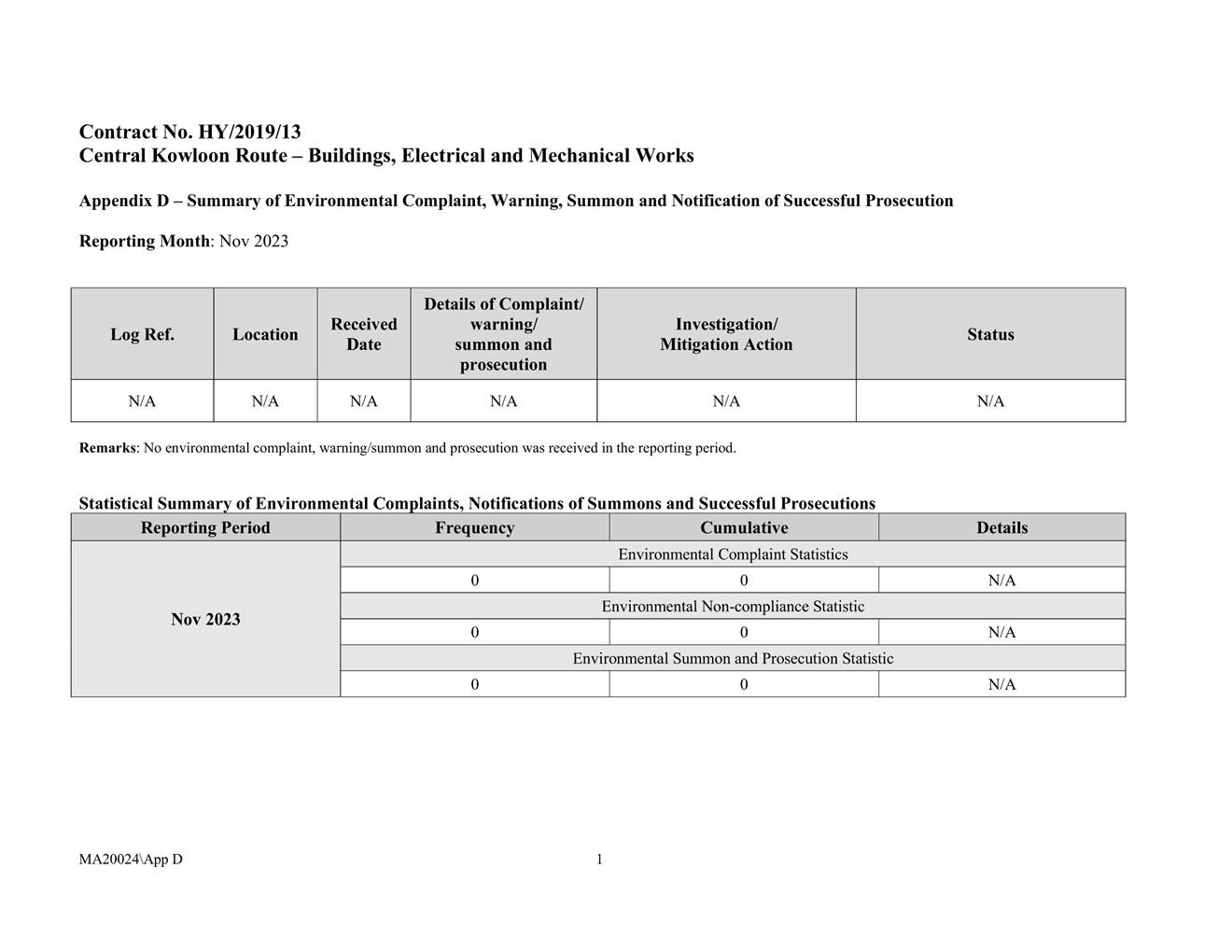 6. No environmental complaints, warning, notifications of summons and successful prosecutions were received in the reporting month. The summary of environmental complaint, warning, summon and notification of successful prosecution for the Project is presented in Appendix D