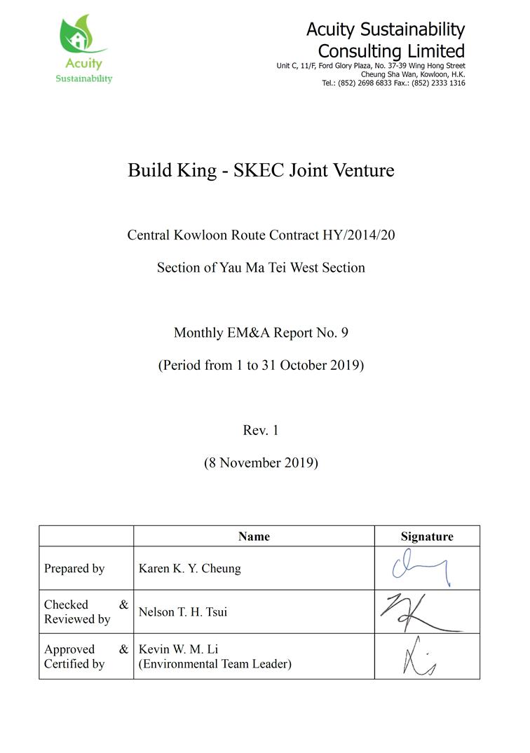 A.1 Build King – SKEC Joint Venture (“Contractor”) commenced the construction works of Highway Department (HyD) Central Kowloon Route Contract No. HY/2014/20 – Section of Yau Ma Tei West (“The Project”) on 12 February 2019. This is the 9th monthly Environmental Monitoring and Audit (EM&A) report presenting the EM&A works carried out during the period from 1 October 2019 to 31 October 2019.