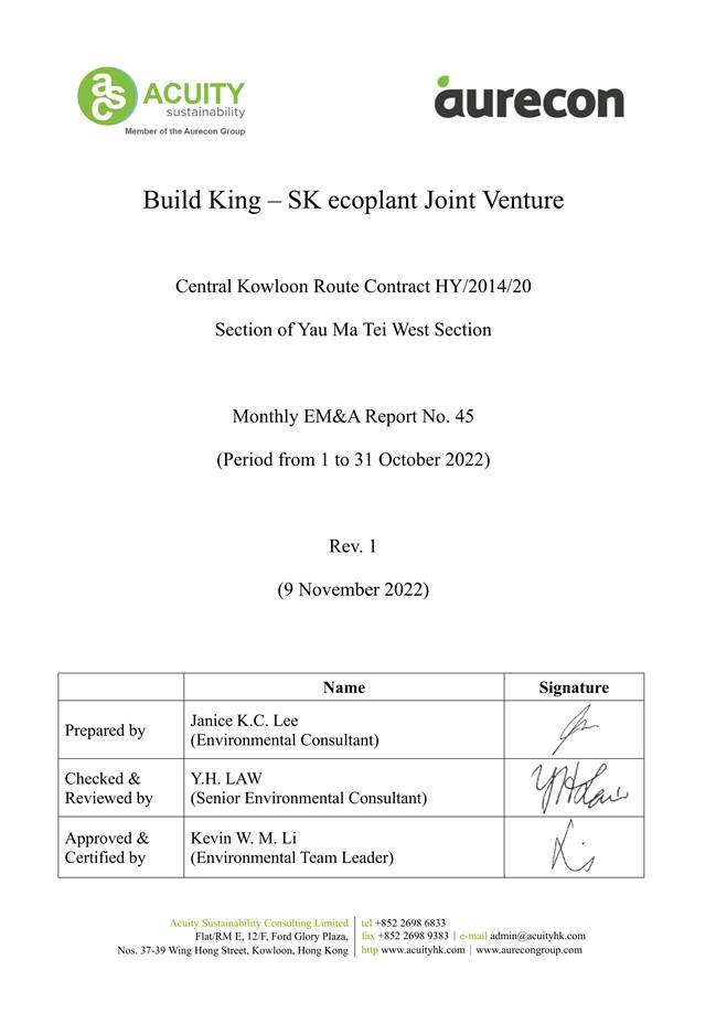A.1 Build King – SK ecoplant Joint Venture (“Contractor”) commenced the construction works of Highway Department (HyD) Central Kowloon Route Contract No. HY/2014/20 – Section of Yau Ma Tei West (“The Project”) on 12 February 2019. This is the 45th monthly Environmental Monitoring and Audit (EM&A) report presenting the EM&A works carried out during the period from 1 October 2022 to 31 October 2022.