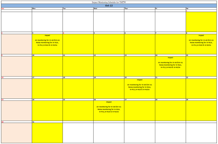 A.5 Joint weekly site inspections were conducted by representatives of the Contractor, Engineer and Contractor’s ET on 6, 13, 20 and 27 October 2022. One joint site inspection with IEC also undertaken on 20 October 2022. Details of the audit findings and implementation status are presented in Section 5.