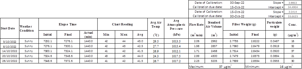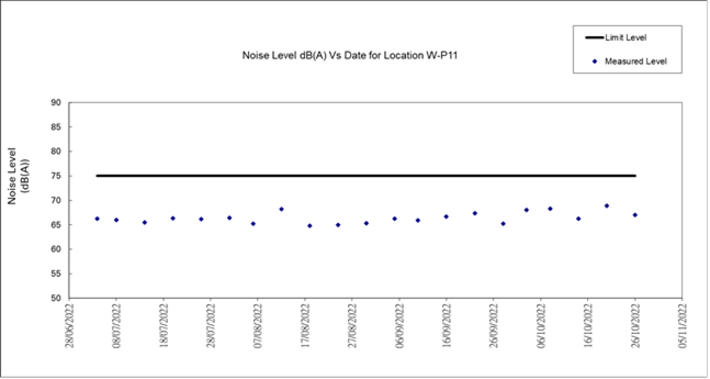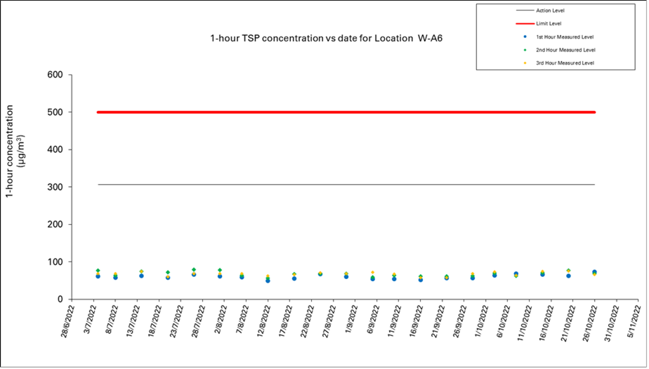 A.7 One Action Level of construction noise weas triggered during the reporting period as a documented complaint was received on 28 October 2022 related to construction noise from works areas at Portion 1D. No exceedance of Limit Level of construction noise was recorded in the reporting month. No exceedance of the Action and Limit Level of 24-hour TSP and 1-hour TSP was recorded in the reporting month.