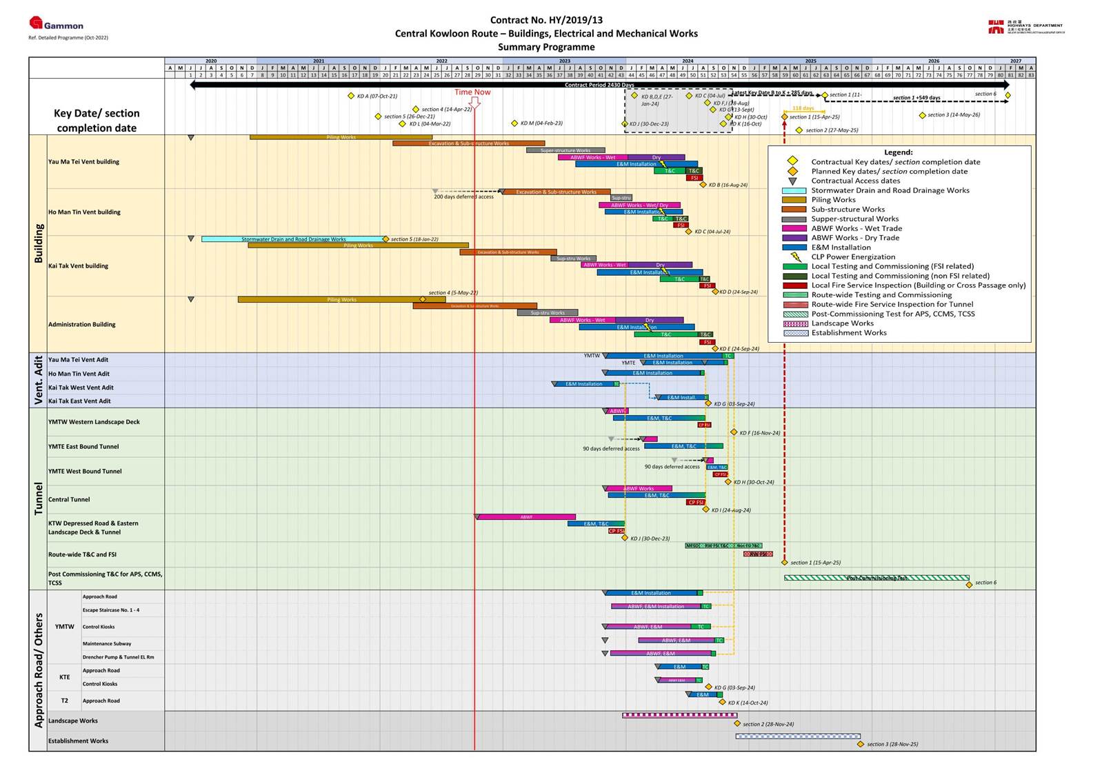 · Pre-drilling Works at Portion 1B and 1D · Socket H-Pile (Landscaped Deck and Bridges) at Portion 1B and 1D · Noise Barrier C02, C03 & S01 (along Lin Cheung Road) at Portion 1E · Bridge Deck Construction at Bridge C2 Deck 3 at Portion 1E and 1B · Bridge Deck Construction at Bridge B2 Deck 2 at Portion 1E and 1B · Bridge Deck Construction at Bridge C Deck 2 and Bridge B Deck 1 at Portion 1E and 1B · Abutment B-C construction at Portion 1B · Bridge D construction at Portion 1E · Vent. Adit Ch 175~240 at Zone 4B, 4C and A1 at Portion 1E · Parapet Wall Construction at Bridge G at Portion 1B · Abutment Wall Construction at Slip Road E at Portion 1B · Excavation and Lateral Support Works (Segment 4, 7, 10 to 12) for Vent. Adit and Depressed Road Construction including Escape Route Staircase No. 1 to 3 at Portion 1F and 10 · Vent Adit Ch 280~290 at Segment 4 at Portion 1D · Vent Adit Ch 300~360 at Segments 7 & 10 including Road Slab at Portion 1F · Vent Adit Ch 360~410 at Segment 11 including Road Slab at Portion 1F · Elevated Hoi Wang Road at Portion 1D · Landscaped Construction at Segment 7 at Portion 1D · Pile Cap, Wall and Column Construction along Hoi Wang Road (Segment 5, 6, 7, 8 and 9) at Portion 1D |