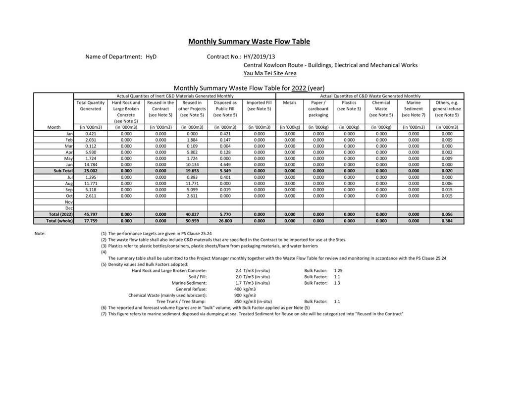 4.3 Site audits were carried out on a weekly basis to monitor and audit to ensure that proper storage, transportation and disposal practices of waste materials generated during construction activities, such as construction and demolition (C&D) materials and general refuse are being implemented. The summary of site audits is shown in Table 6.1 of this report. The implementation status of the waste/chemical management measures in the reporting period are summarized in Appendix C.