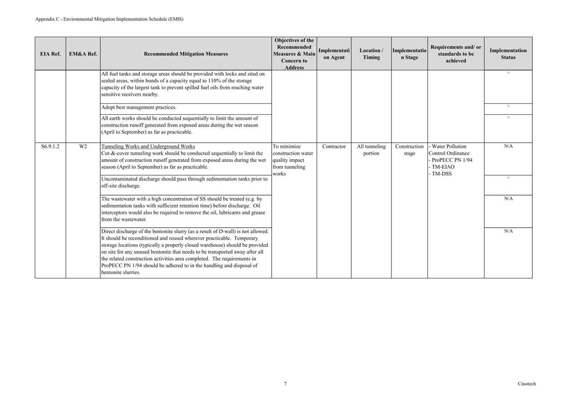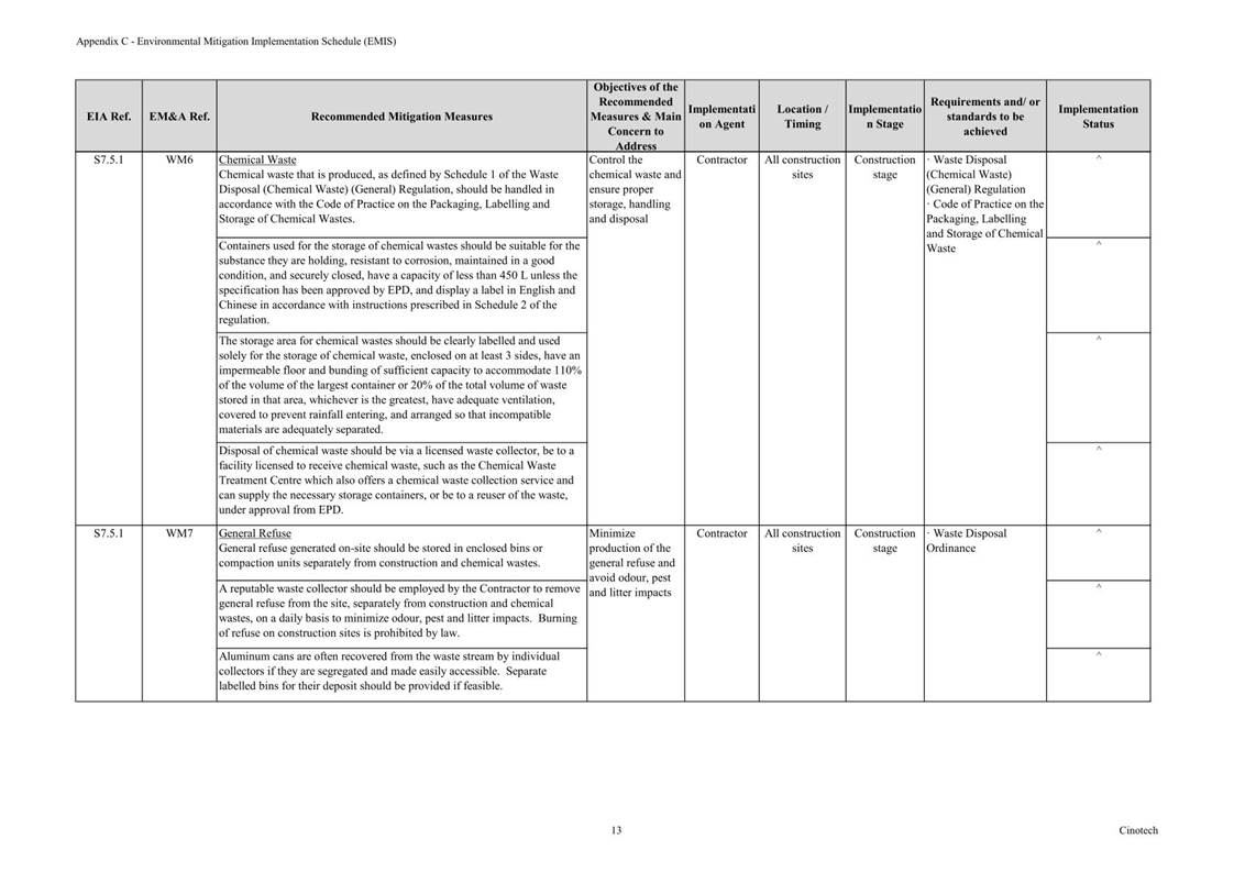 6.3 According to Environmental Permit, the approved EIA Report (Register No.: AEIAR-171/2013), and the EM&A Manual of the Project, the mitigation measures detailed in the documents are recommended to be implemented during the construction phase. An Environmental Mitigation Implementation Schedule (EMIS) is provided in Appendix C.