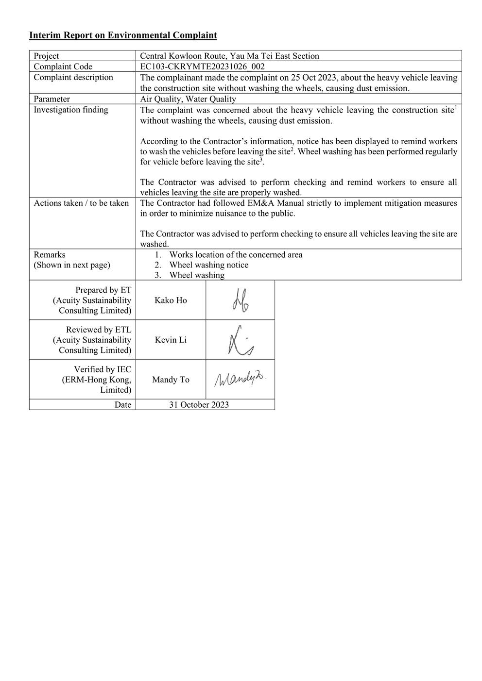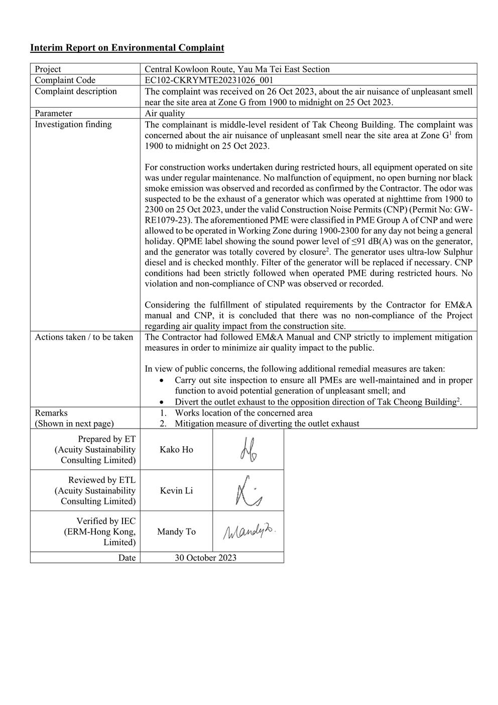 A.8 A total of four environmental complaints were received in the reporting month. After investigation with Contractor, precautionary measures had been proposed to the Contractor by ET. The interim reports for the complaints are shown in Appendix Q.
