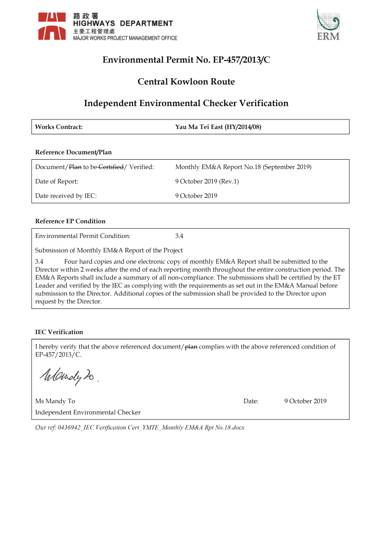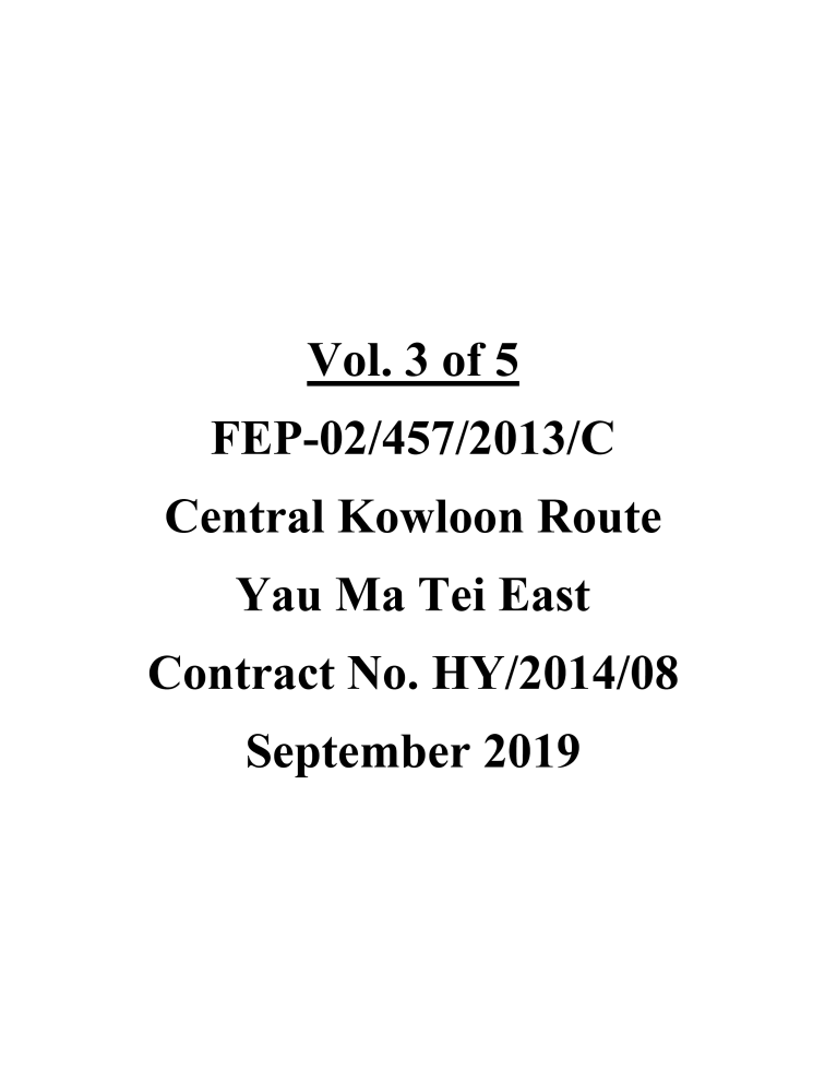 1.2. The Central Kowloon Route – Design and Construction Environmental Impact Assessment Report (Register No.: AEIAR-171/2013) was approved with conditions by the Environmental Protection Department (EPD) on 11 July 2013. An Environmental Permit (EP 457/2013) was issued on 9 August 2013. Variations of EP (VEP) was subsequently applied for and the latest EP (EP-457/2013/C) was issued by EPD on 16 January 2017. A Further EP (FEP-02/457/2013/C) was issued by EPD on 5 March 2018.