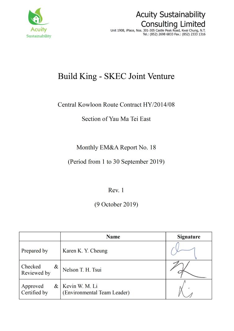 A.1 Build King – SKEC Joint Venture (“Contractor”) commenced the construction works of Highway Department (HyD) Central Kowloon Route Contract No. HY/2014/08 – Section of Yau Ma Tei East (“The Project”) on 20 April 2018. This is the 18th monthly Environmental Monitoring and Audit (EM&A) report presenting the EM&A works carried out during the period from 1 September 2019 to 30 September 2019.
