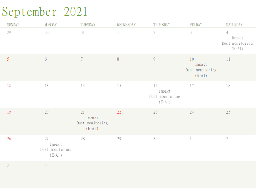 A.5 Bi-weekly inspection of the implementation of landscape and visual mitigation measures by ET was conducted on 1, 15 and 29 September 2021. Details of the audit findings and implementation status are presented in Section 5.