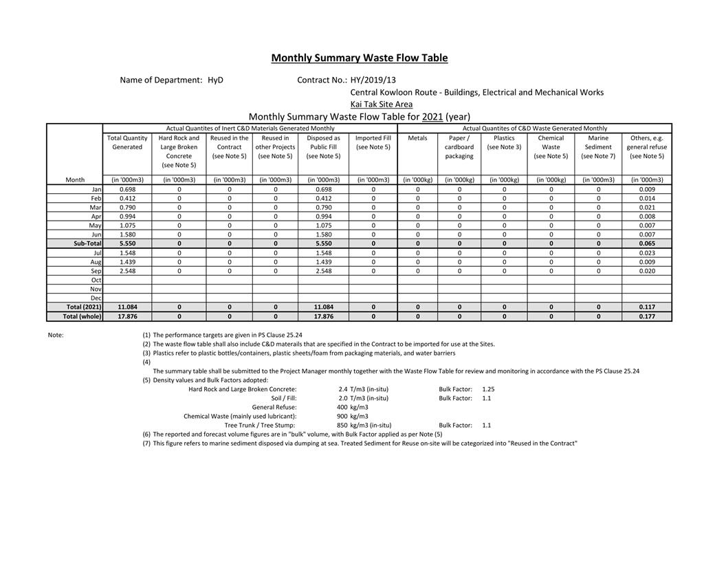 A.1 Alchmex – Paul Y Joint Venture (“Contractor”) commenced the construction works of Highway Department (HyD) Central Kowloon Route Contract No. HY/2018/02 – Section of Kai Tak East (“The Project”) on 9 September 2019. This is the 25th monthly Environmental Monitoring and Audit (EM&A) report presenting the EM&A works carried out during the period from 1 September 2021 to 30 September 2021.