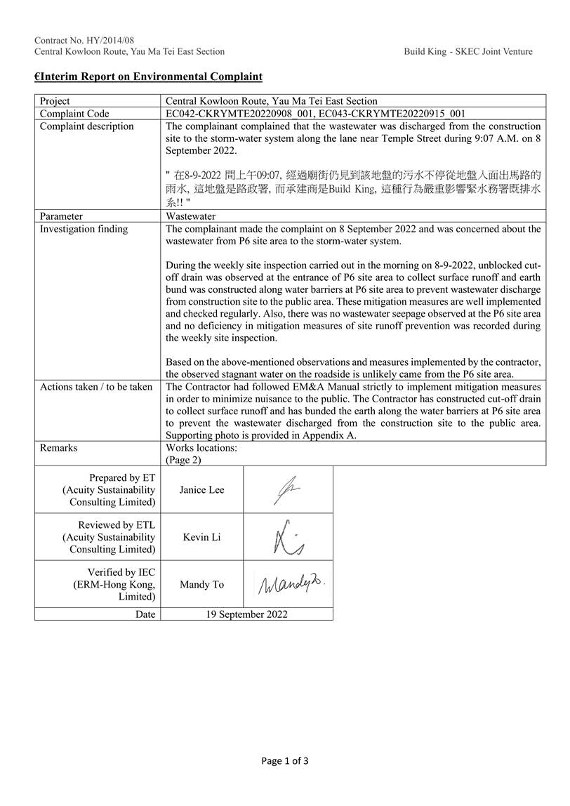 A.8 One water seepage related complaint was received from two sources on 8 and 15 September 2022 respectively. After investigation with Contractor, precautionary measures had been proposed to the Contractor by ET. The interim report for the complaint is shown in Appendix Q.