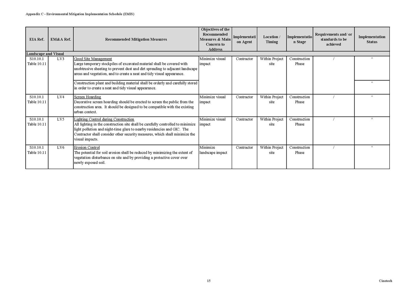 6.3 According to Environmental Permit, the approved EIA Report (Register No.: AEIAR-171/2013), and the EM&A Manual of the Project, the mitigation measures detailed in the documents are recommended to be implemented during the construction phase. An Environmental Mitigation Implementation Schedule (EMIS) is provided in Appendix C.