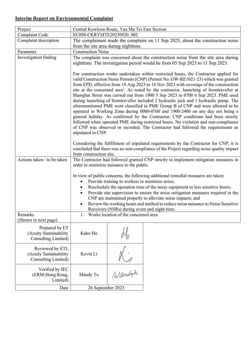 A.7 Two Action Level of construction noise was triggered during the reporting month as documented complaints were received. No exceedance of Limit Level of construction noise was recorded in the reporting month. No exceedance of the Action and Limit Level of 24-hour TSP and 1-hour TSP was recorded in the reporting month.