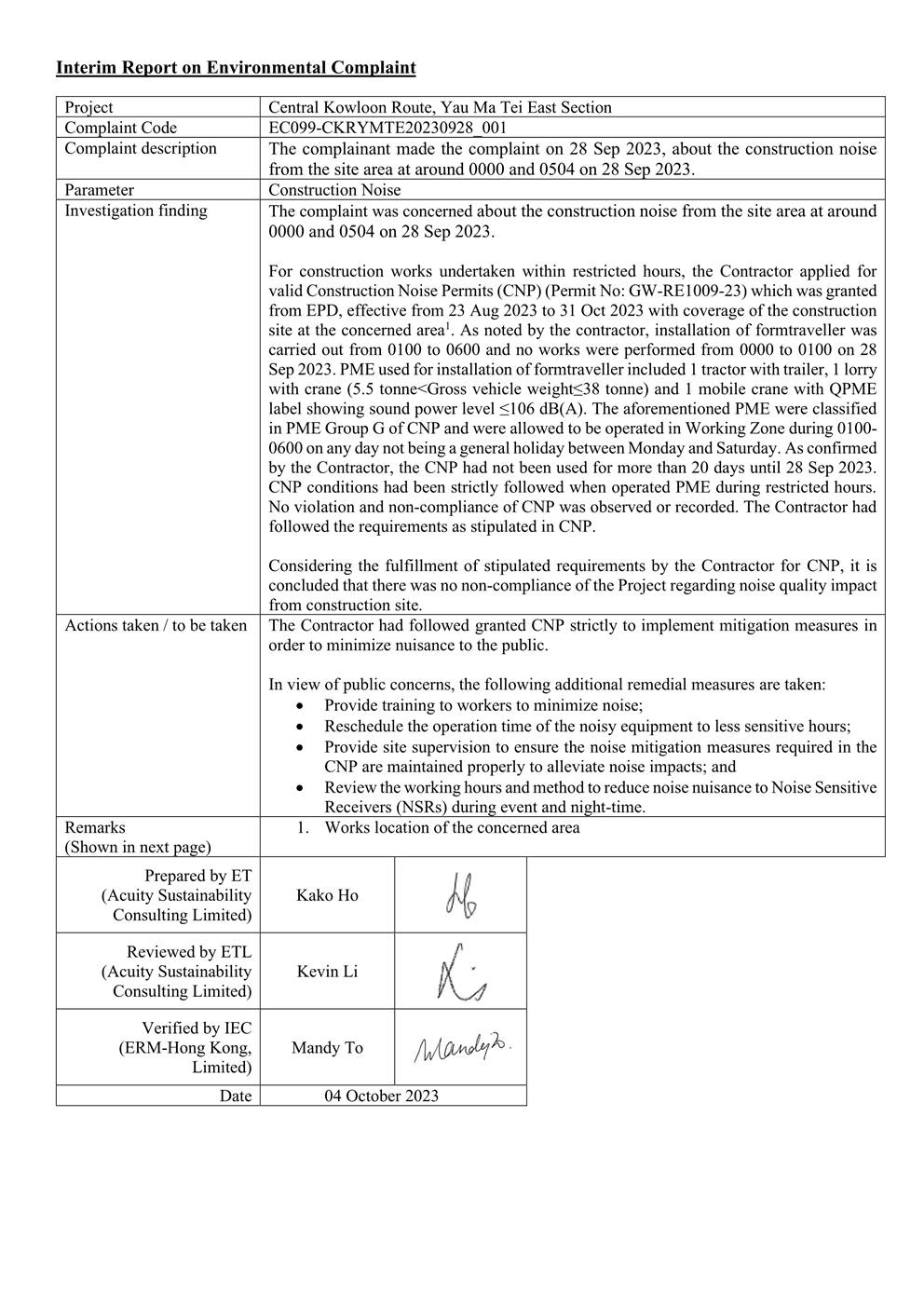 A.8 A total of four environmental complaint was received in the reporting month. After investigation with Contractor, precautionary measures had been proposed to the Contractor by ET. The interim reports for the complaints are shown in Appendix Q.