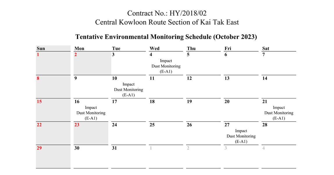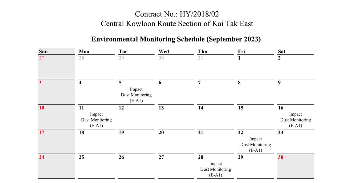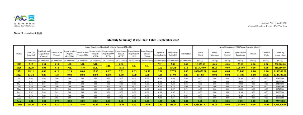 A.1 Alchmex – Paul Y Joint Venture (“Contractor”) commenced the construction works of Highway Department (HyD) Central Kowloon Route Contract No. HY/2018/02 – Section of Kai Tak East (“The Project”) on 9 September 2019. This report is the 49th monthly Environmental Monitoring and Audit (EM&A) report presenting the EM&A works carried out during the period from 1 September 2023 to 30 September 2023.