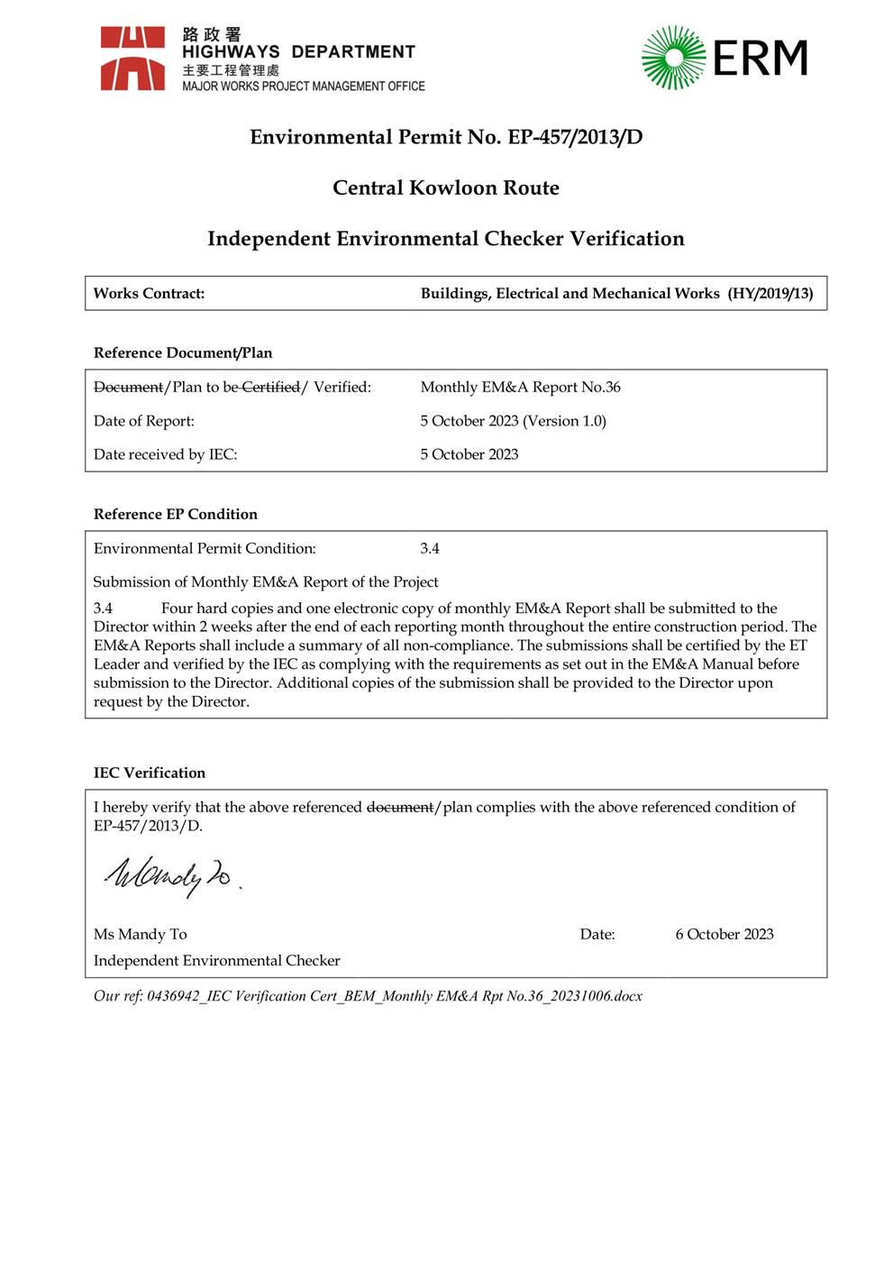 1.2. The Central Kowloon Route – Design and Construction Environmental Impact Assessment Report (Register No.: AEIAR-171/2013) was approved with conditions by the Environmental Protection Department (EPD) on 11 July 2013. An Environmental Permit (EP 457/2013) was issued on 9 August 2013. Variations of EP (VEP) was subsequently applied for and the latest EP (EP-457/2013/D) was issued by EPD on 15 June 2021.