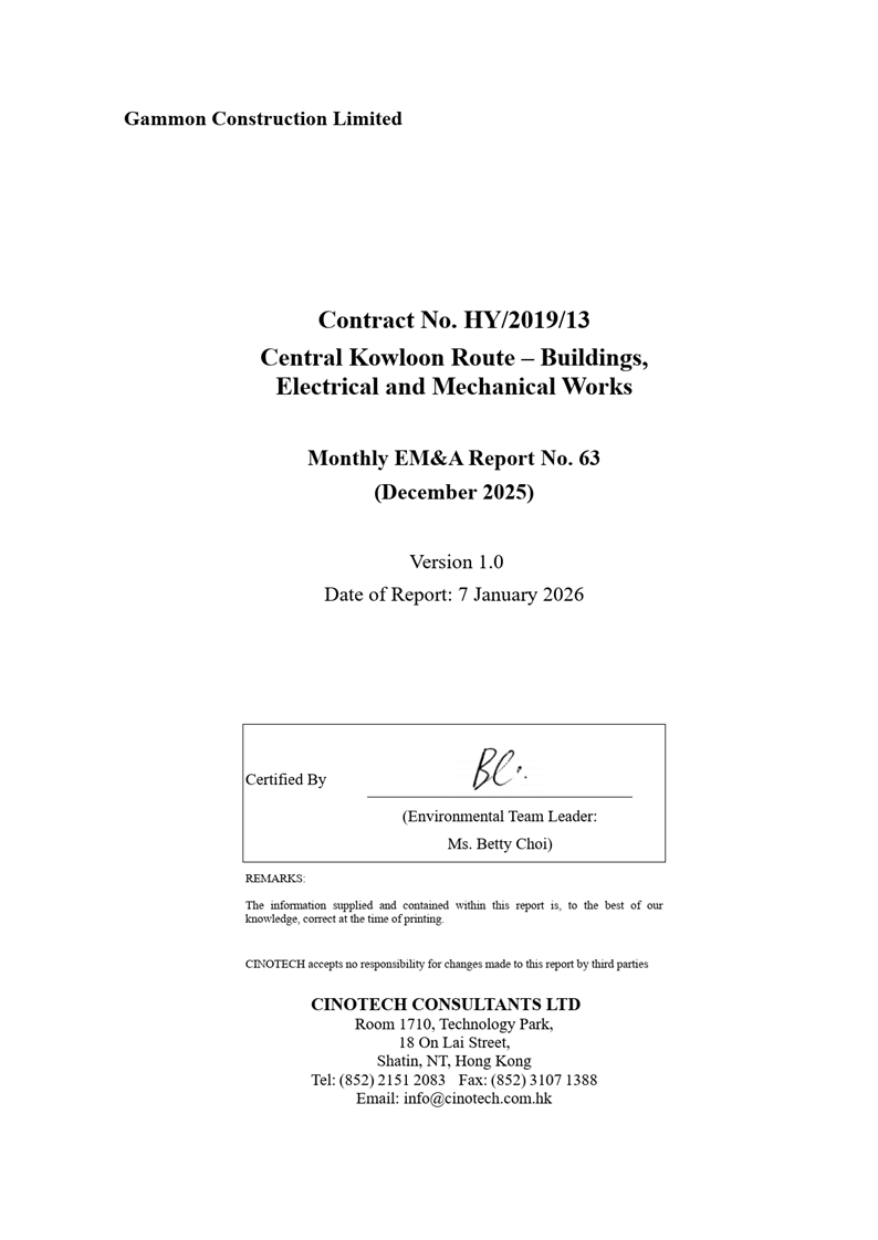 A.1            Build King – SK ecoplant Joint Venture (“Contractor”) commenced the construction works of Highway Department (HyD) Central Kowloon Route Contract No. HY/2014/20 – Section of Yau Ma Tei West (“The Project”) on 12 February 2019. The Project is tentatively scheduled to be completed in March 2026, with the last EM&A report expected to be submitted in April 2026. This is the 83rd monthly Environmental Monitoring and Audit (EM&A) report presenting the EM&A works carried out during the period from 1 December 2025 to 31 December 2025.
