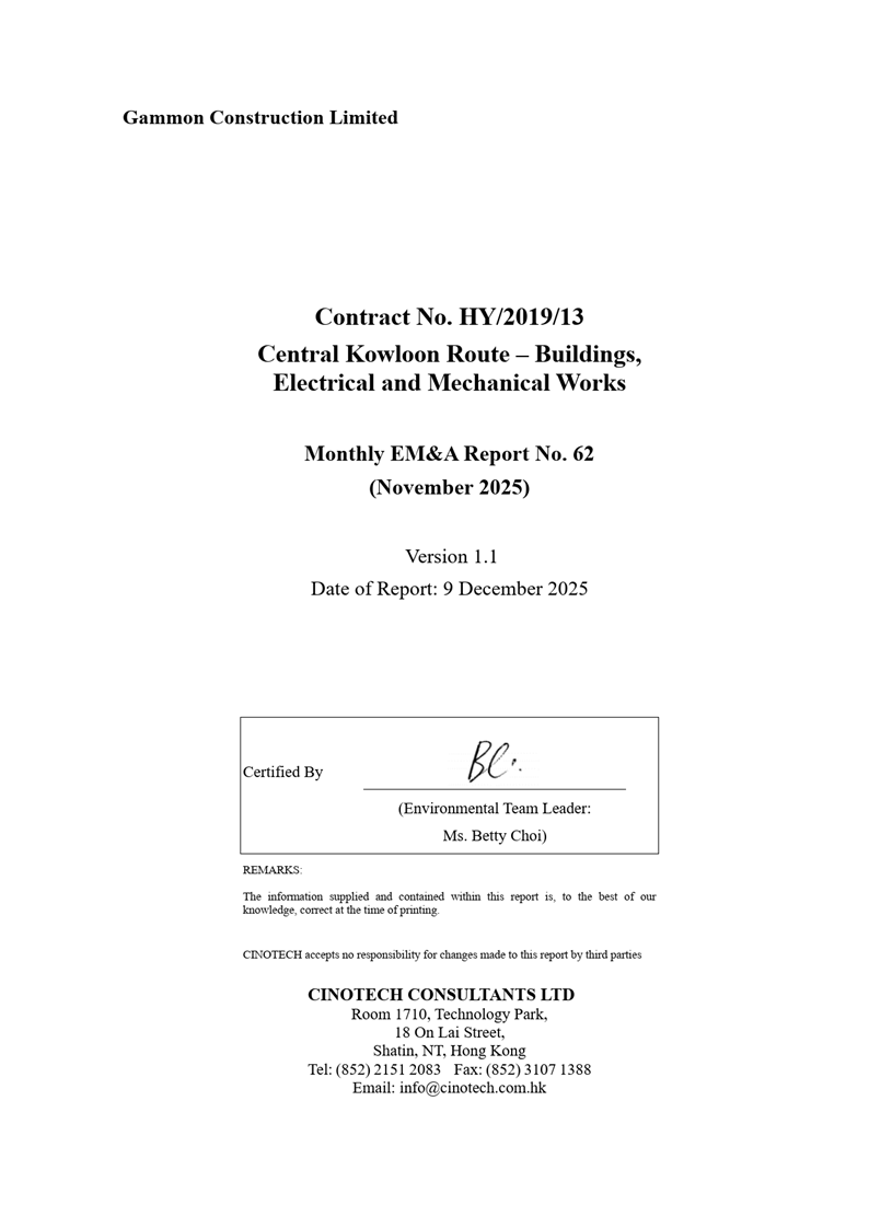 A.1 Alchmex – Paul Y Joint Venture (“Contractor”) commenced the construction works of Highway Department (HyD) Central Kowloon Route Contract No. HY/2018/02 – Section of Kai Tak East (“The Project”) on 9 September 2019. This report is the 75th monthly Environmental Monitoring and Audit (EM&A) report presenting the EM&A works carried out during the period from 1 November 2025 to 30 November 2025.